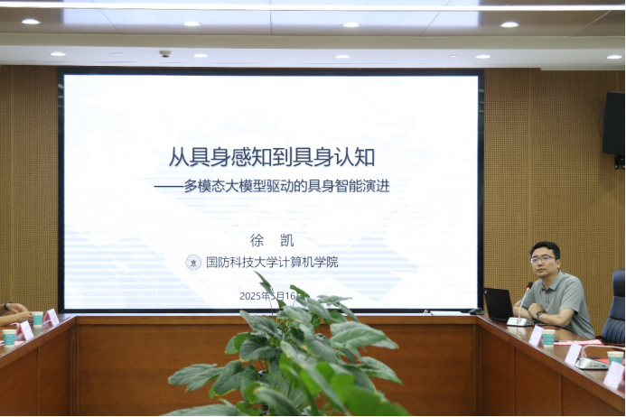 紧接着,徐凯教授带来了题为“从具身感知到具身认知 —— 多模态大模型驱动的具身智能演进”的主题报告。徐凯教授谈到,在交互过程中主动感知环境是具身智能系统的重要特性。过去几年,三维感知虽取得显著进展,但具身感知仍面临诸多局限,如无法应对开放环境、缺乏认知过程建模等,而多模态大模型的出现,为具身智能的发展带来新契机。徐凯教授详细介绍了相关研究进展,包括多模态大模型驱动的开放词汇在线语义分割和主动场景图构建、基于认知过程建模的物体目标导航、基于环境认知推理的室内物品整理等。在交流环节,老师们和同学们积极提问,就 VLA 的关键技术挑战及未来发展方向等问题与徐凯教授展开深入探讨,徐凯教授耐心解答,现场学术氛围浓厚。