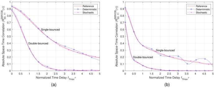 图2(a)单峰分布、(b)多峰分布下,空-时相关函数的理论结果与仿真结果的比较