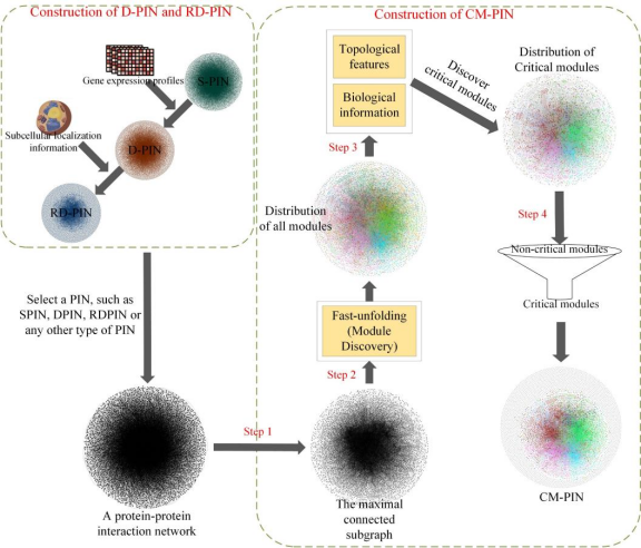方法的整体思想是,首先提取给定PIN中的最大连通子图,并通过Fast-unfolding算法将其划分为不同的模块;然后使用蛋白质的直系同源信息、亚细胞定位信息和模块在PIN中的拓扑信息来甄别关键模块;最后根据甄别的关键模块构建细化的蛋白质相互作用网络(CM-PIN)。