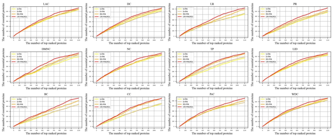 为了验证所提方法的有效性,选取了两个物种(酒酿酵母、人类),基于三种网络(静态蛋白质互作网络S-PIN、动态蛋白质互作网络D-PIN、细化的动态蛋白质互作网络RD-PIN),分别构建它们的CM-PIN,并通过12种节点排序方法,对比验证CM-PIN的关键蛋白质识别性能。实验结果表明,在Top100-Top600关键蛋白质的识别数、Jackknifing曲线、PRAUC值、敏感性、特异性、阳性预测值、阴性预测值、F测量值、Matthews相关系数和准确性等评估指标上,12种节点排序方法在CM-PIN中的表现都是最优的。