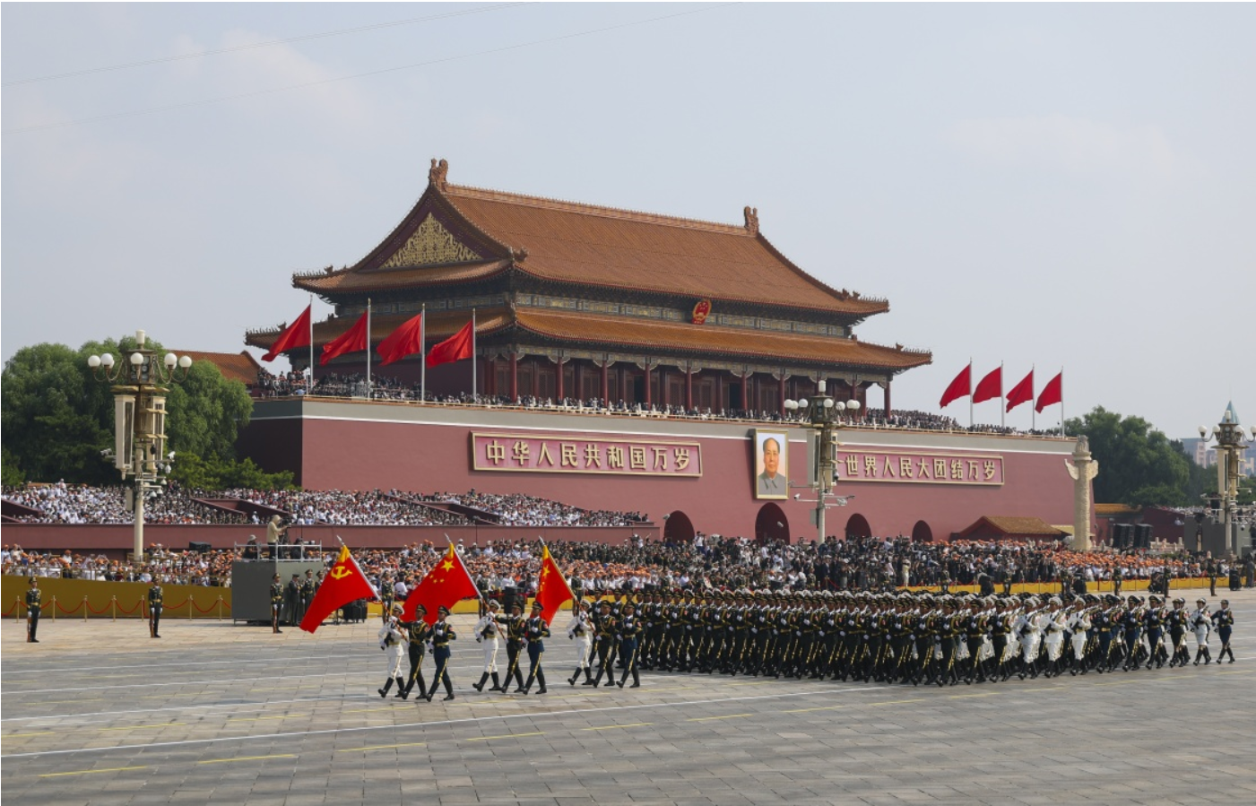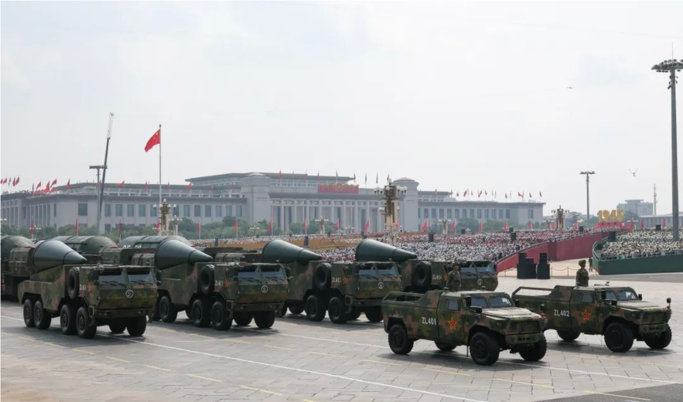 阅兵仪式上,45个方(梯)队依次接受检阅,涵盖了徒步方队、战旗方队、装备方队和空中梯队等。受阅装备中既有传统主战力量,也有新域新质力量,部分陆海空基战略重器、高超精打、无人和反无人装备首次亮相,充分彰显我国国防和军队现代化建设的巨大成就与强大的军事实力。观看过程中,师生们被受阅部队的威武雄姿所深深震撼,每当先进的武器装备和整齐划一的方队通过天安门广场时,现场都会响起热烈的掌声和欢呼声。