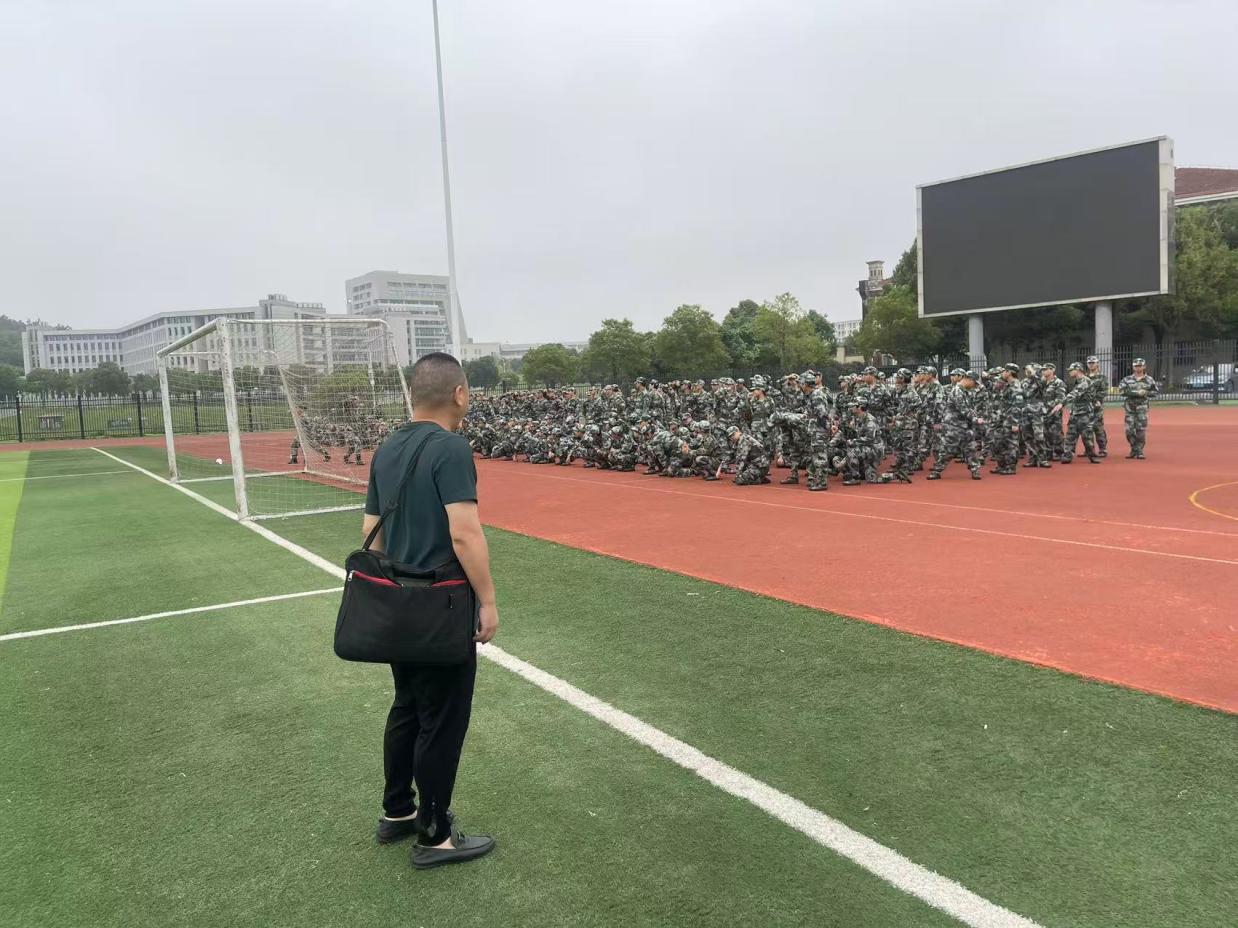 当日上午,荣军老师和鲁睿其老师专程前往军训场地看望员工。老师们穿梭在训练队伍中,仔细查看同学们的训练状态,关切询问大家的身体状况与适应情况,并为学子们加油鼓劲。